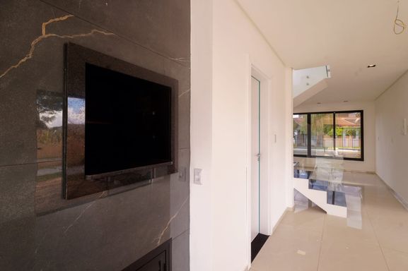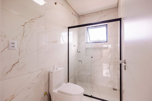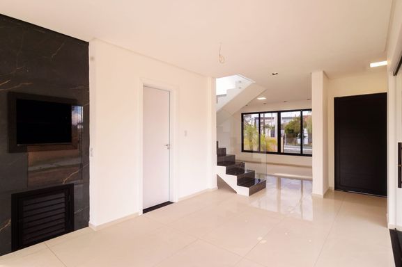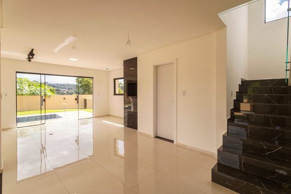 No piso térreo, a integração entre a cozinha, sala de estar e sala de jantar cria um espaço harmonioso e funcional, promovendo convivência e praticidade. O lavabo e o banheiro social são um diferencial para atender tanto os moradores quanto as visitas com comodidade. A casa ainda conta com uma ampla área de serviço, garantindo organização e praticidade para o dia a dia.