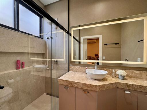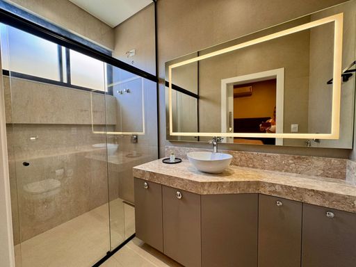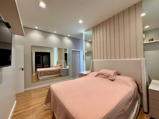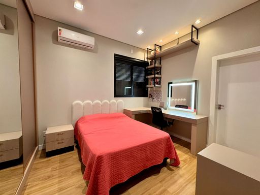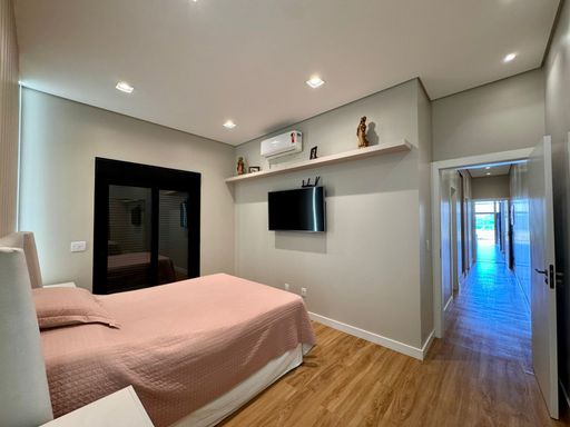 O imóvel conta com quatro suítes aconchegantes, todas equipadas com ar-condicionado, proporcionando conforto em todas as estações do ano. A suíte principal merece destaque por ser extremamente silenciosa, com porta acústica e janelas em vidro, criando um verdadeiro refúgio para descanso.