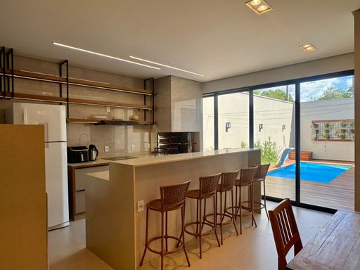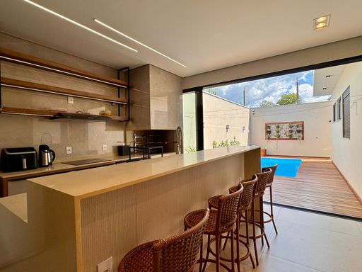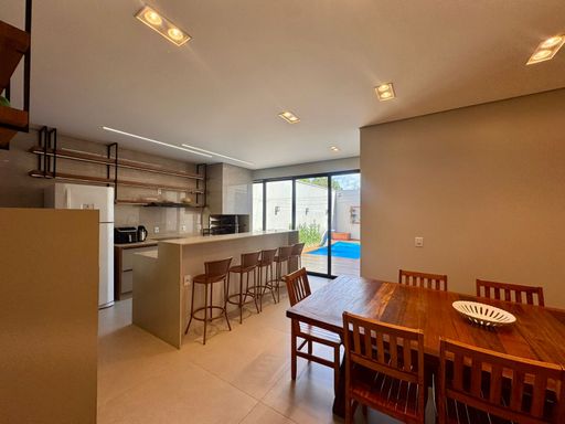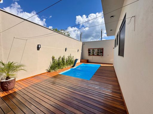 Na área externa, a casa convida a viver momentos especiais. A piscina com aquecimento solar permite aproveitar em qualquer época do ano, integrada a um deck em madeira Ipê que traz charme e sofisticação ao ambiente.