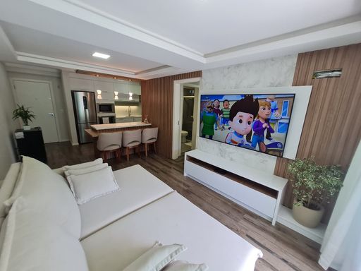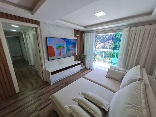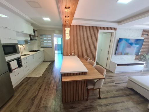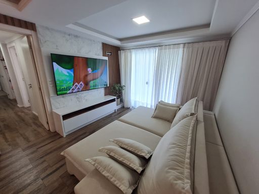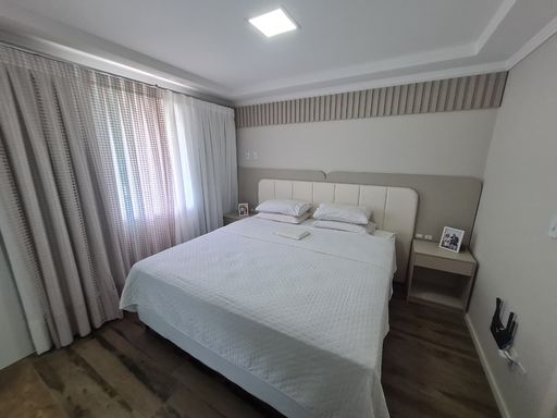 Banheiros e cozinha apresentam acabamento em mármore, reforçando o padrão diferenciado do imóvel. O apartamento também dispõe de rebaixamento em gesso, iluminação em LED, preparação para ar-condicionado, cortinas instaladas em todos os ambientes e móveis planejados que valorizam cada espaço.
