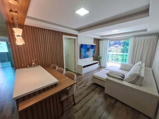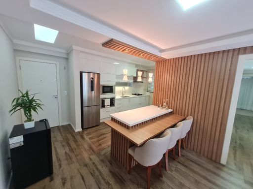 A área social conta com sala de estar e jantar integradas, criando um ambiente moderno e acolhedor. A sacada, equipada com sistema Reiki, churrasqueira e pia de apoio, amplia o espaço de convivência e garante excelente ventilação e iluminação natural.